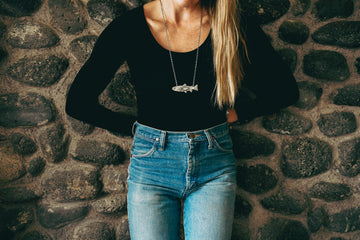 This sweet old fish is built deep with three layers of silver, hand textured and carved, and set with mossy aquamarines the color of a winter river.