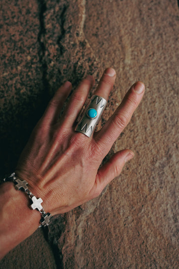 This is a close wearing, heavily built ring featuring a bright blue cut of Ithaca turquoise that sits atop a simple but graphic metal design. This band is continuous and formed from 16ga sheet sterling so it has a really nice anchoring weight to it. I love the look of this ring on! Very bold and clean. It's one of a kind at this point in time but I will be leaning into this graphic design style in 2025 which draws on the patterns I see used in old weavings as well as quilting patterns.