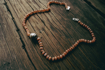 Gorgeous peach moonstones with a big Tahitian Pearl on hand knotted silk -- so much feminine softness here. Just lovely. Sterling silver s-clasp and hang tag with a bronze accent at the clasp.