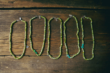 Pale green serpentine paired with turquoise crosses or sterling silver charms. Sterling silver s-clasp and hang tag with a bronze accent at the clasp.