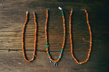 Fabulous spiny oyster beads paired with sterling charms on hand knotted silk. Sterling silver s-clasp and hang tag with a bronze accent at the clasp.