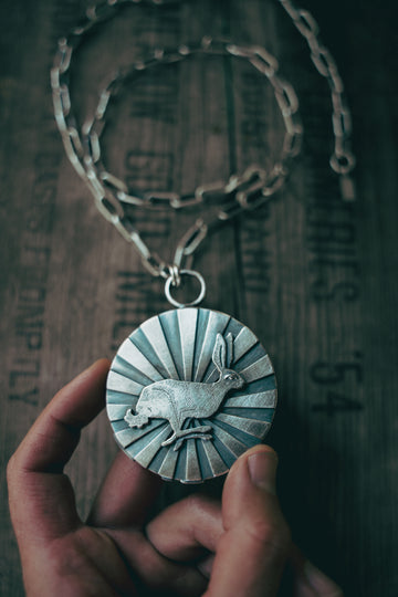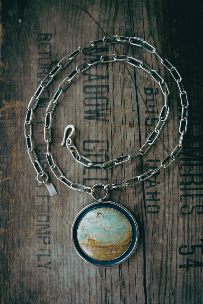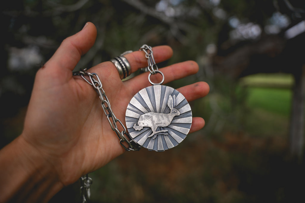 Layers and layers and layers of sterling silver, handmade chain, heavy duty hand formed and forged clasp, a beautiful jackrabbit catching air in the sunshine and an enormous and rare cut of Gunnary Point jasper in beauty hues.