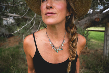 These charm necklaces feature: little orchard snakes, quilt squares, arrows, jackrabbits, sagebrush sprigs, hearts, lucky horseshoes, western diamonds, square crosses and a smattering of turquoises, lapis lazuli, coral, mother of pearl carved flowers and pearls.