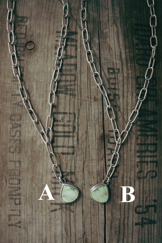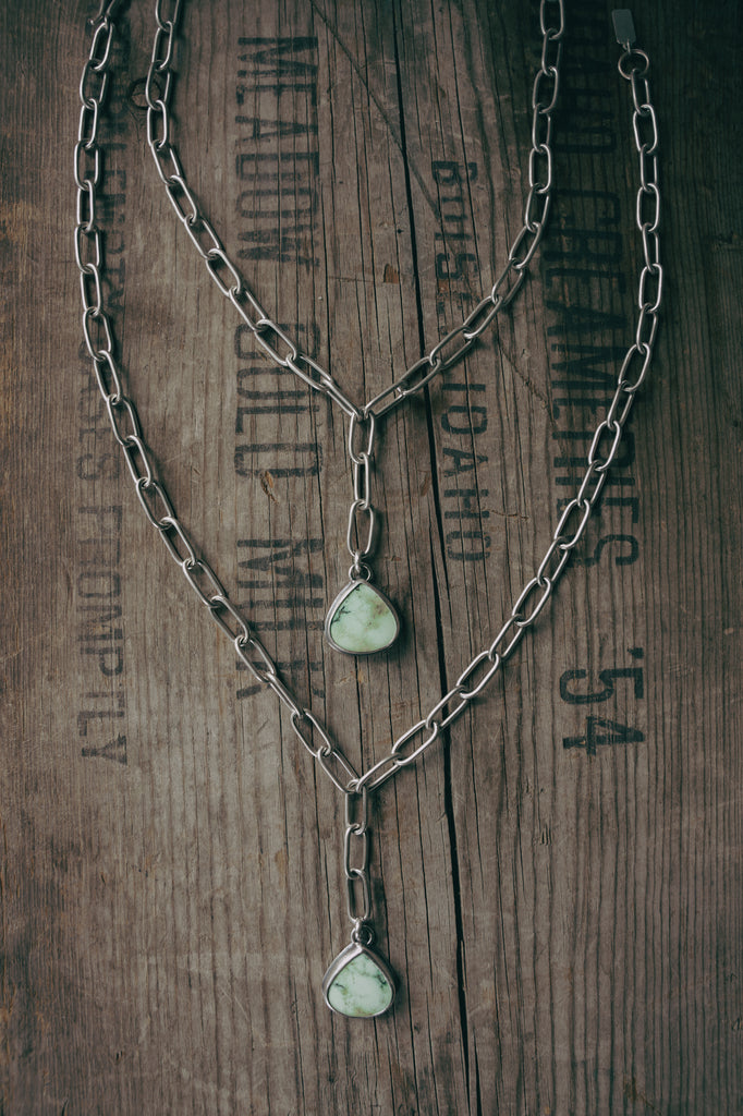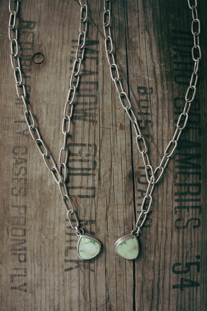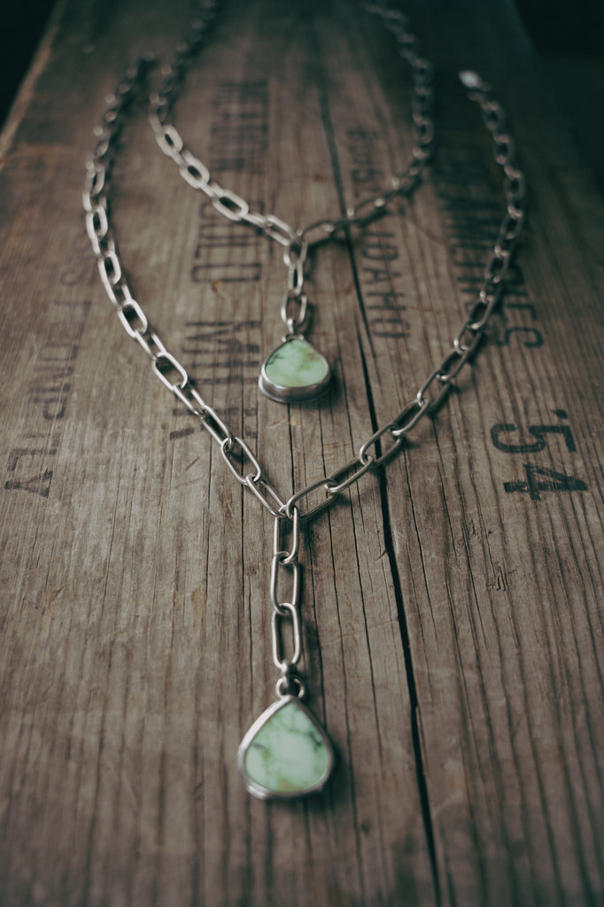 I made two! Heavy heavy handmade paperclip chains anchored by absolutely fresh and delicious teardrop cuts of Prince Variscite out of the magnificent Great Basin of the beautiful USA. These necklaces are extremely clean and elegant feeling with great presence and weight -- bare and strong, like a horse without a saddle.