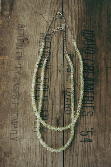I've always loved prehnite and these beads are a tranquil and ethereal pale green. Peaceful. Sterling silver chain lengths and clasps.