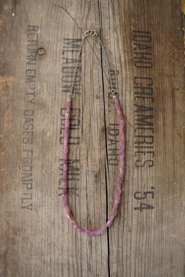 Unusual raw ruby beads in a wonderful earthy magenta color. Sterling silver chain lengths and clasps.