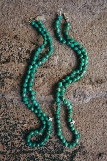 These strands feature old stock American Turquoise with an offset sterling cross charm on hand knotted silk.