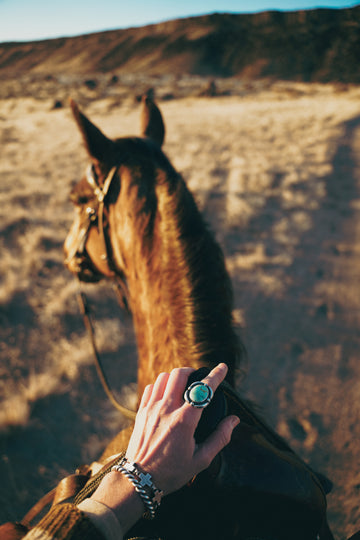 A gorgeous, sturdy setting for an effervescent cut of turquoise and it's all perched atop a fabricated band that began in my studio as multiple pieces of wire in multiple gauges. I love this ring band, it adds so much texture and dimension to this piece and it brings to mind some of the old beautiful fabrics women wore in the form of dresses, skirts, blouses and vests back when it wasn't considered ladylike to wear dungarees.