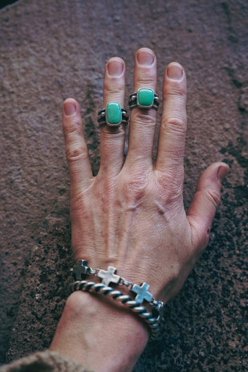 Lucin Variscite in a glorious minty hue -- this green is like verdigris or jadeite. I've paired these stones with some rugged bands that begin in my studio as multiple pieces of wire in multiple gauges before being soldered together and formed. I love this ring band style, it adds so much texture and dimension to a simple stone setting and it brings to mind some of the old beautiful fabrics women wore in the form of dresses, skirts, blouses and vests back when it wasn't considered ladylike to wear dungarees.