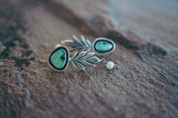 Framed Snowville Variscite cabochons paired with dimensional leaves and Akoya pearls with the nicest shivery skin you ever saw. Luminous. Quiet. Interesting. Approximate rhyme. One of a kind.