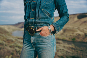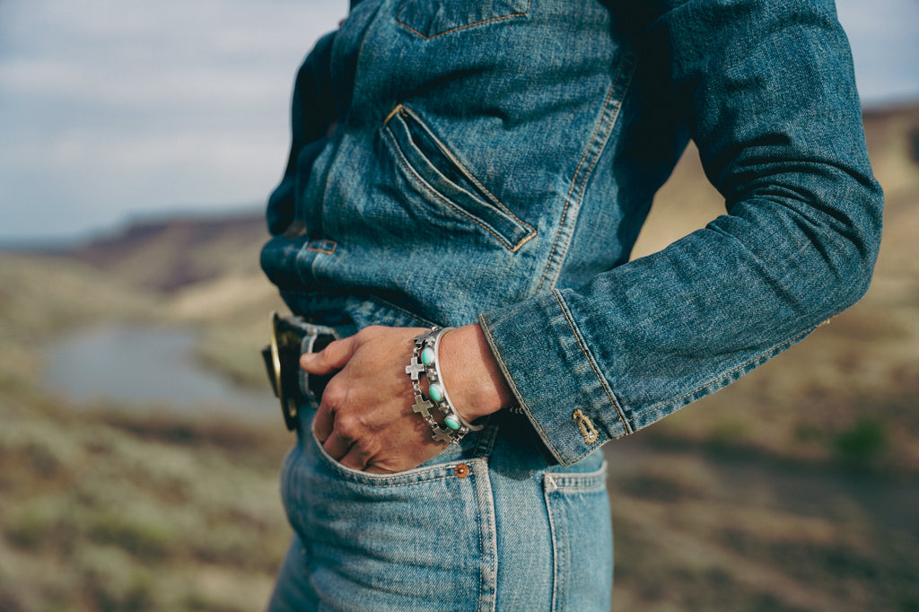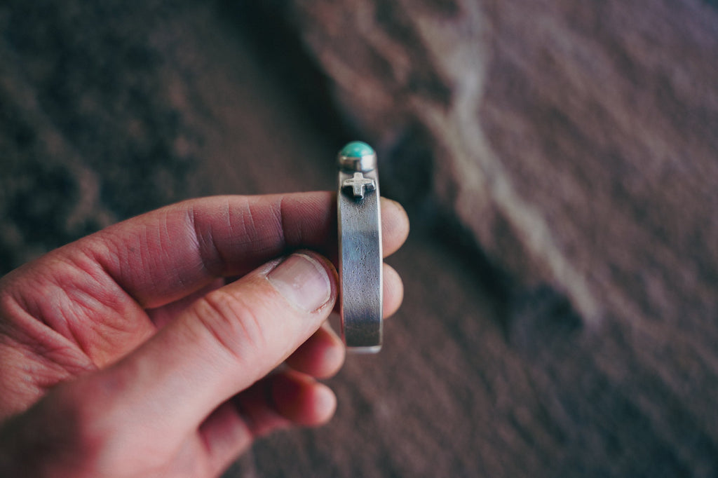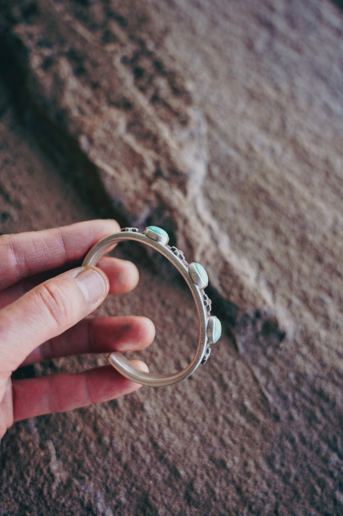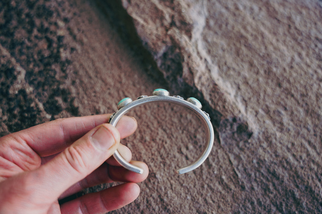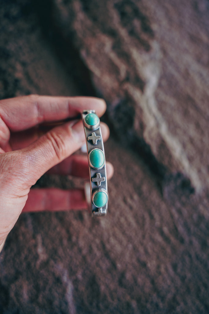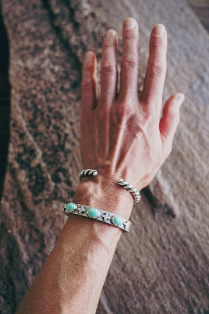 A heavy, thick cuff featuring square crosses and oval cuts of Kingman turquoise -- good for what ails ya. Lovely on its own and really beautiful layered up with other bracelets. I have two in stock! Catch them while you can!