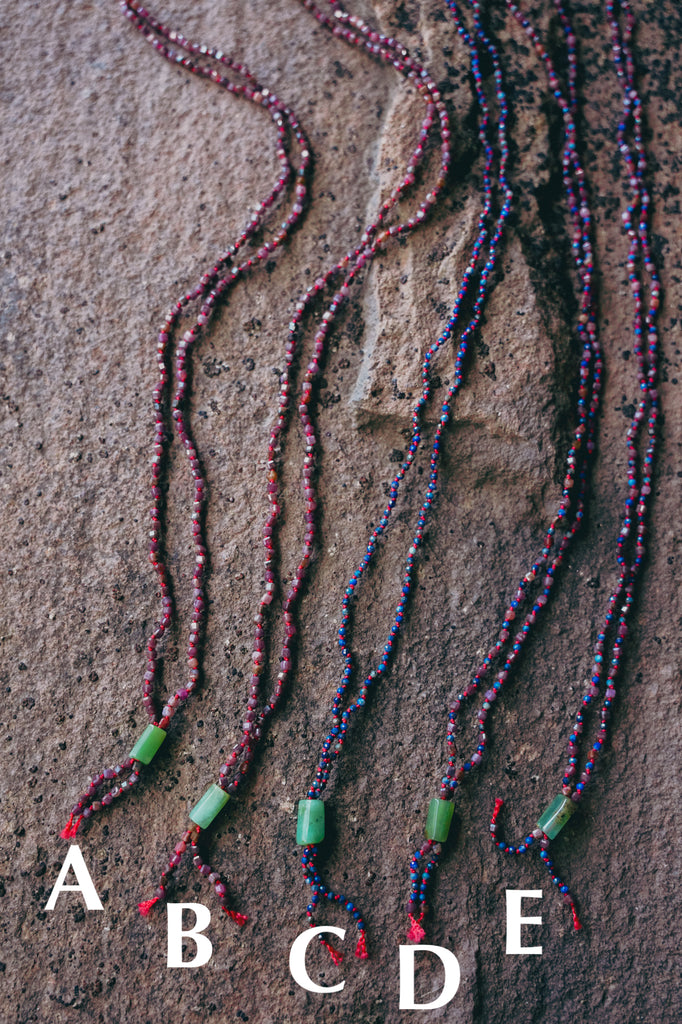 Tiny tiny tiny faceted lapis lazuli and ruby beads anchored with cheery chrysoprase on hand-knotted silk. A little bit of twinkle that still manages to be very earthy.