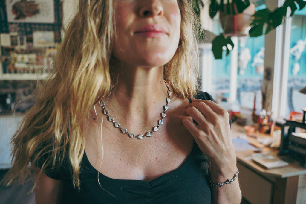 This design features 25 of my voluminous hearts attached nose to tail in a 18 inch chain -- a repetitive, rhythmic pattern that wraps all the way around the neck. This chain is absolutely beautiful and feels incredible on. Heavy and delicate. Chunky and elegant. Dimensional and abundant love. Beautiful alone as a trademark necklace and fabulous when layered up with other pieces for a more eclectic look.
