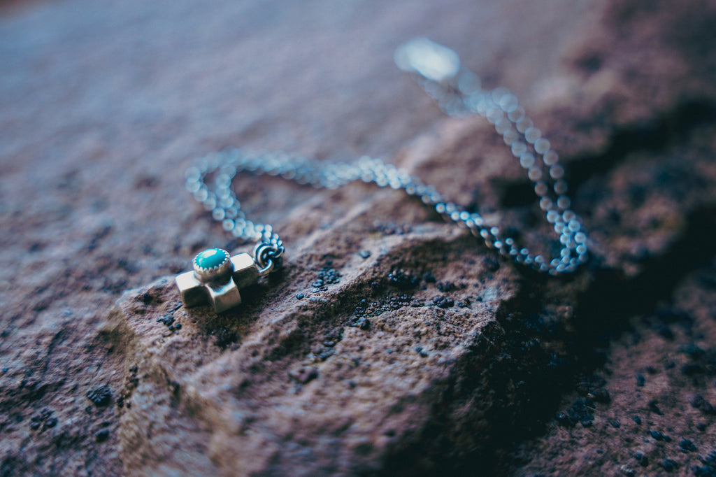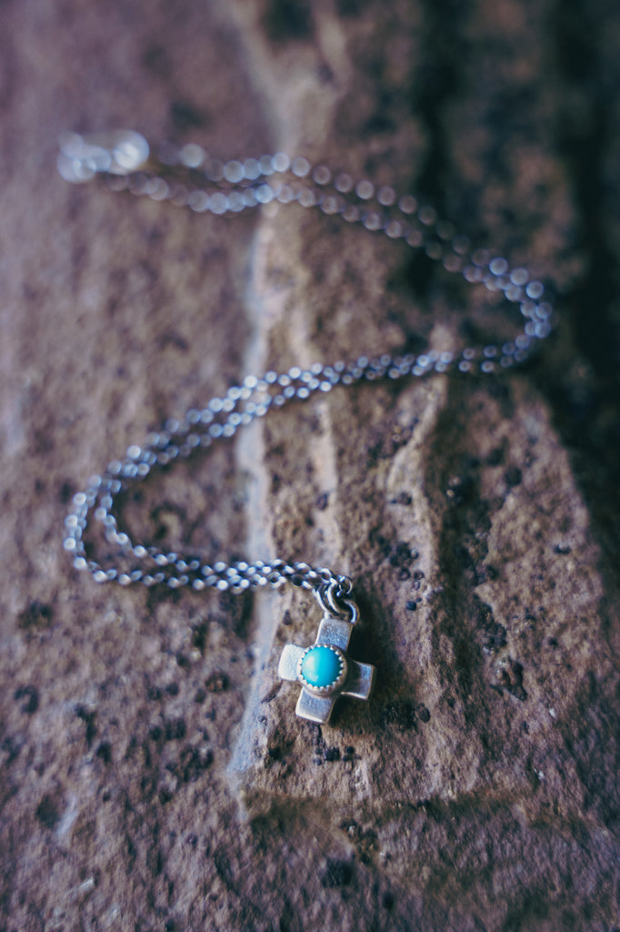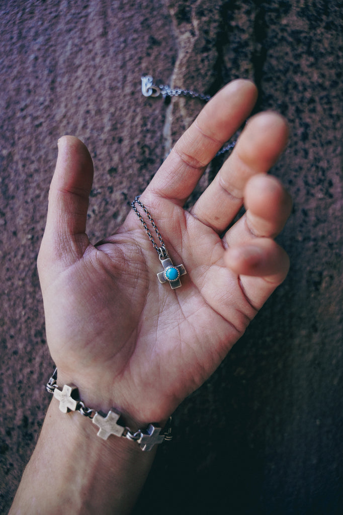 My chunky little rugged square cross with a daub of Kingman turquoise in an deep-water bright blue. For everyday wear to help remind you that the load is lighter than you think.