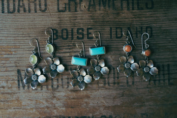 Blossoms in three ways featuring coral, turquoise or prehnite. All sterling silver.