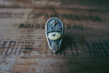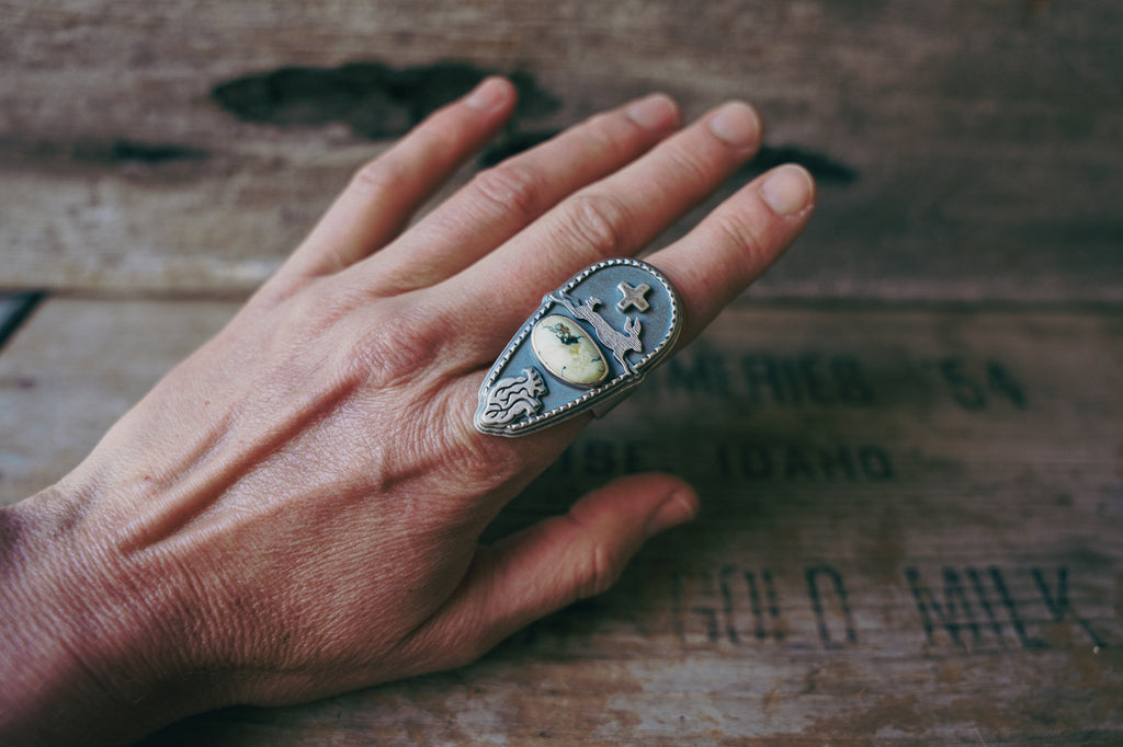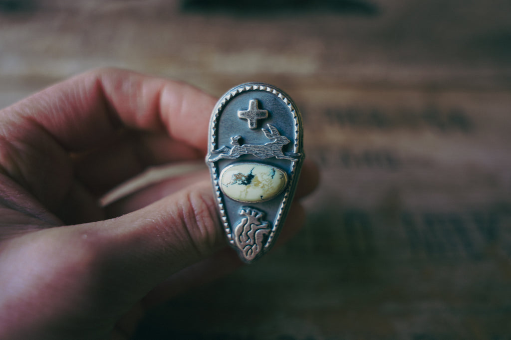 I've paired this jackrabbit with a bright, fresh cut of Prince Variscite, an anatomical heart and my square cross. This ring has a really lovely heft and presence to it -- earthy and peaceful, born of wide open spaces and stillness.