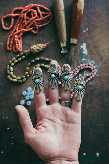 Solid sterling silver construction featuring a saddle ring with appliqué sunburst, a jackrabbit and a slice of Kingman turquoise. I made 5 of these rings. Choose from the available sizes.