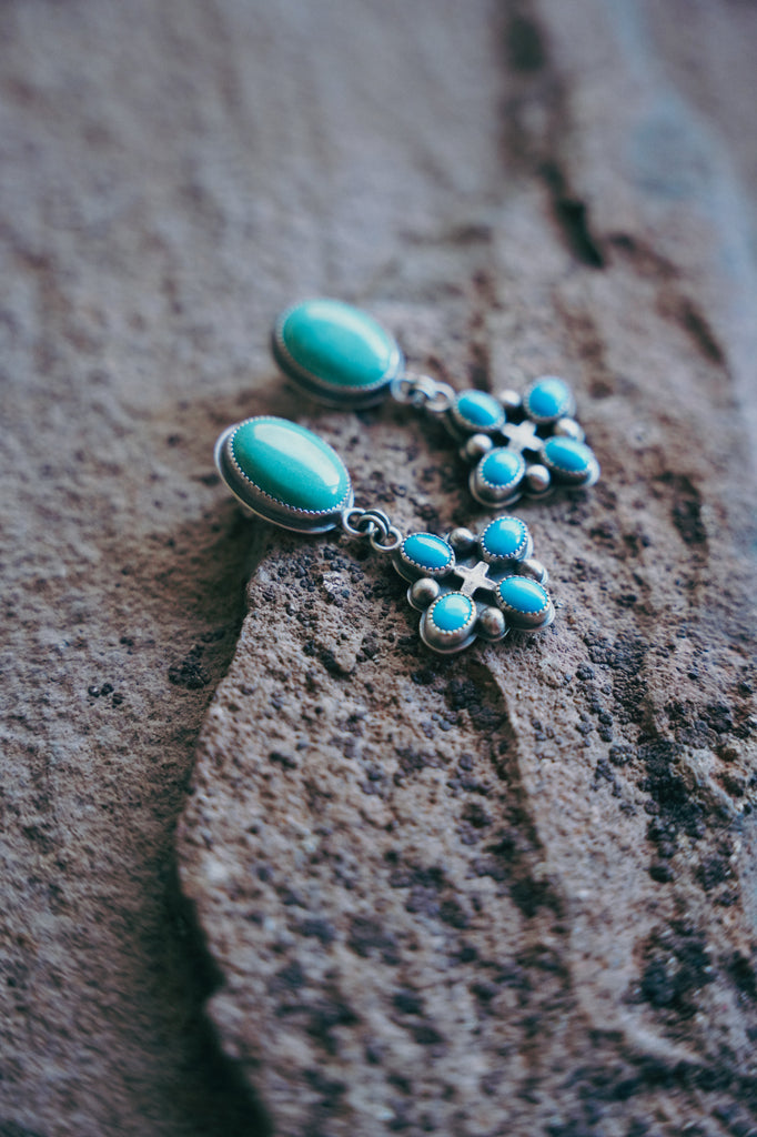 An ornate earring design that has a really lovely, ancient feel. These are post earrings that combine Kingman and old stock Ithaca turquoise with my square crosses. The contrasting color is fresh and the overall look is pretty western in spirit. You're going to turn some heads when you step out in these beauties.