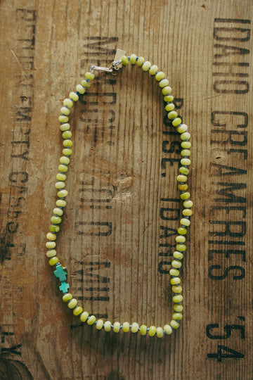 Pale green serpentine paired with turquoise crosses on hand knotted silk. Sterling silver clasp.