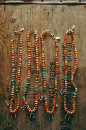 Fabulous spiny oyster beads, turquoise and carved turquoise crosses paired with my sterling horseshoe and flower charms on hand knotted silk. Sterling silver s-clasp and hang tag with a bronze accent at the clasp.