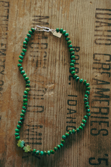 Beautiful beautiful chunky Kingman turquoise beads in a deep green hue with offset hand carved turquoise cross on hand knotted silk. Simple and gorgeous. Sterling silver s-clasp.