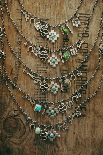 Other charms include my quilt square, snake, jackrabbit, square cross, apple blossom, canyon pendant (with a cut of sky blue Kingman turquoise), my arrow and.....AND MY LUCKY HORSE SHOE! I knew I was forgetting something.