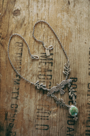 This hawk is paired with a really cool cut of Blue Boy Variscite (mined in the Great Basin) and my sagebrush sprigs. This is such a lovely narrative piece that speaks of wild open spaces and the steppe country I call home.