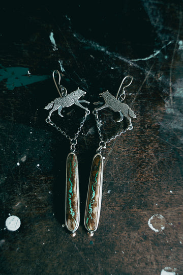 Two carefully constructed wolves, hand textured so they look...FURRY...paired with elegant cuts of boulder turquoise. Plenty of grace and grit here.