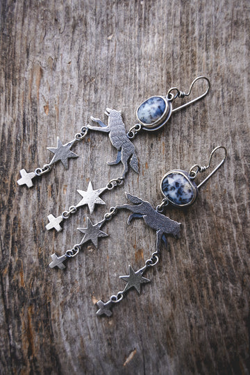 Two carefully constructed wolves, hand textured so they look...FURRY. These little creatures are suspended from faceted cuts of dendritic opal and festooned with stars and square crosses. Plenty of grace and grit here.