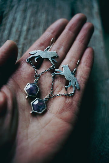 Well time has passed and I've made plenty of little wolf necklaces so I've branched out into wolf earrings. I love this motif and find it creeping into so much of my work lately.
