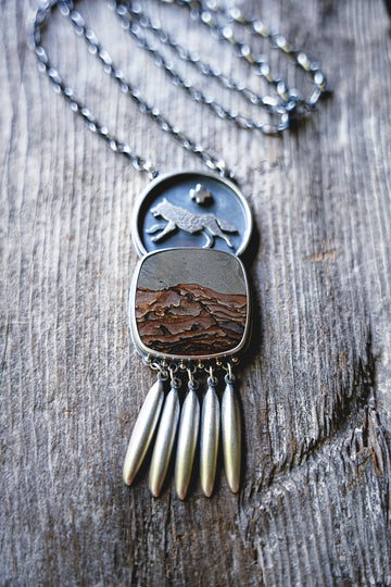 This necklace features a gorgeous cut of Deschutes Jasper paired with my wolf motif and my square cross. This piece is BIG and bold and narrative.