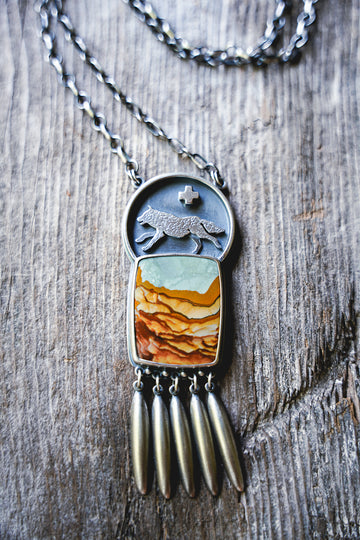This necklace features a gorgeous cut of Rocky Butte Picture Jasper paired with my wolf motif and my square cross. This piece is BIG and bold and narrative.