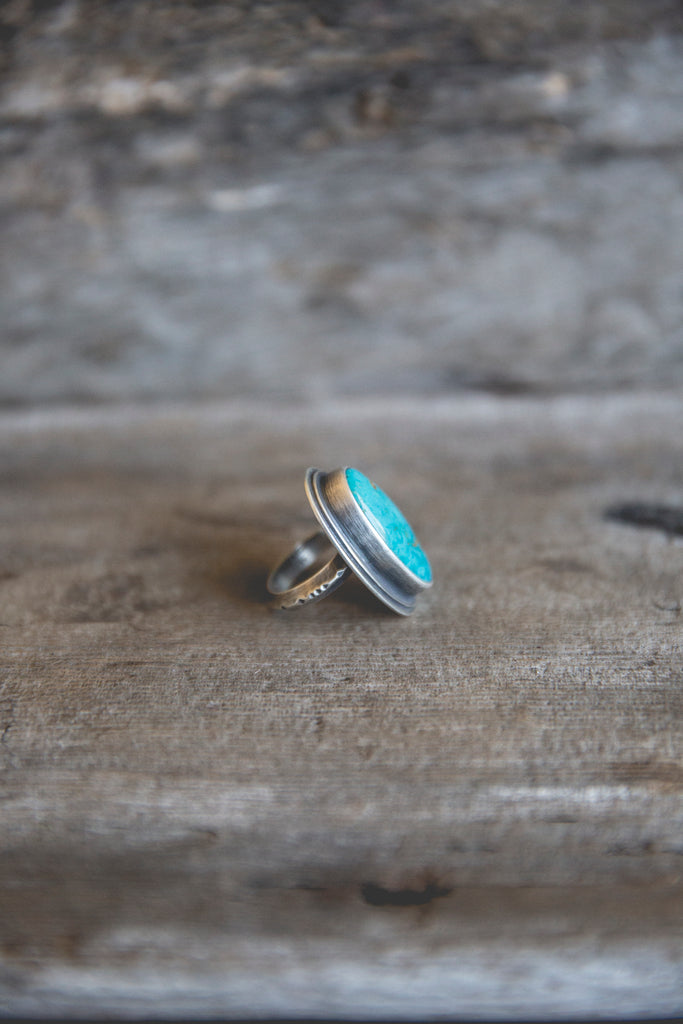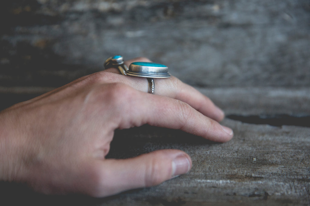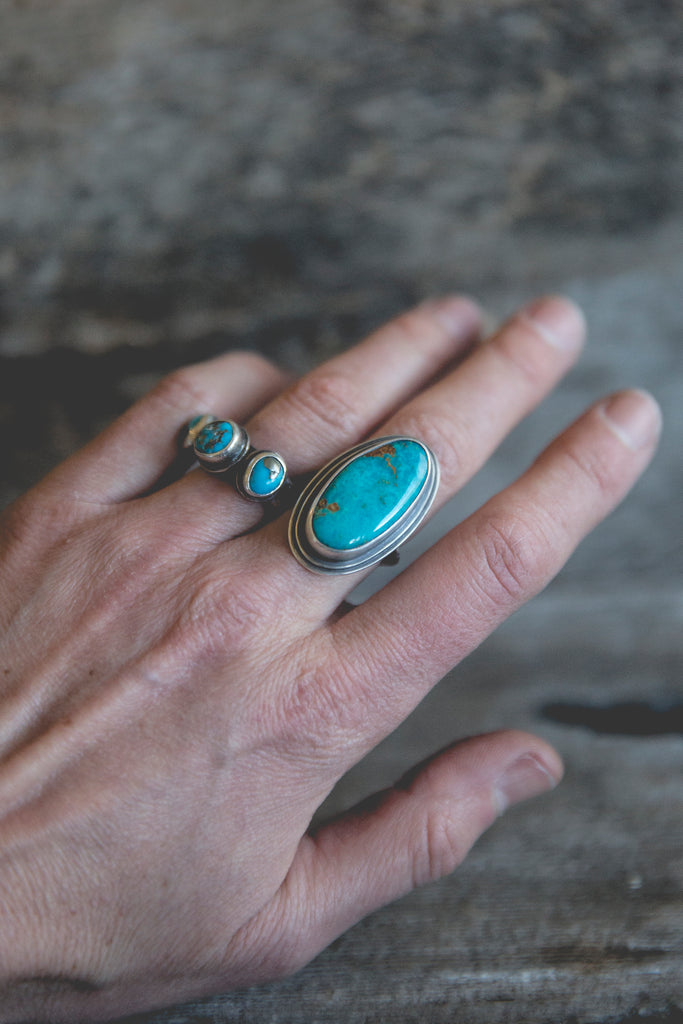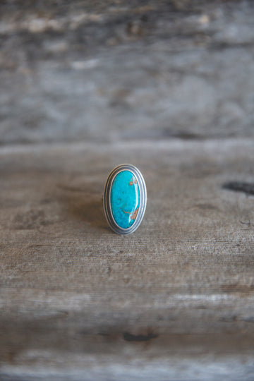 This ring features a beautiful cut of American turquoise in a gorgeous, deep blue hue. This is a heavy and simple setting but it's cleanly crafted and enduring. You'll be surprised by the weight of it.