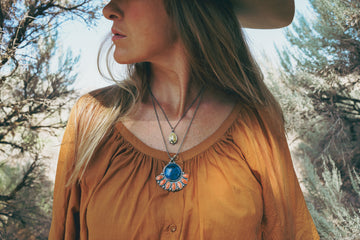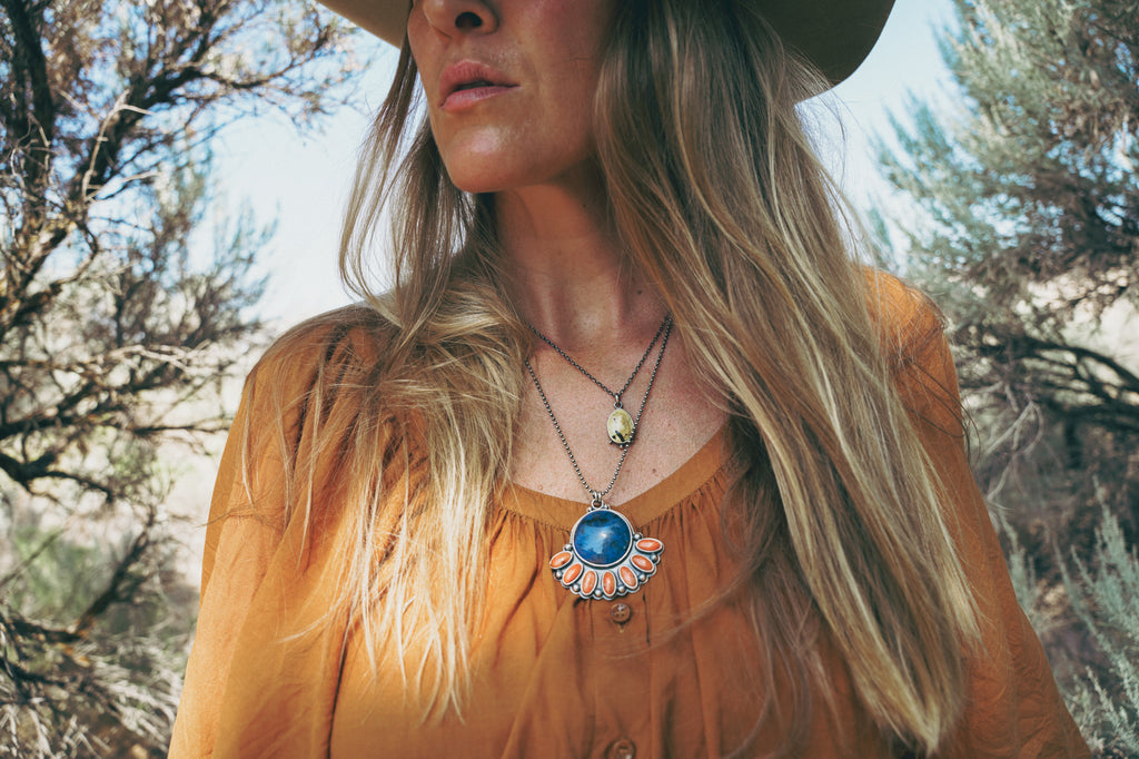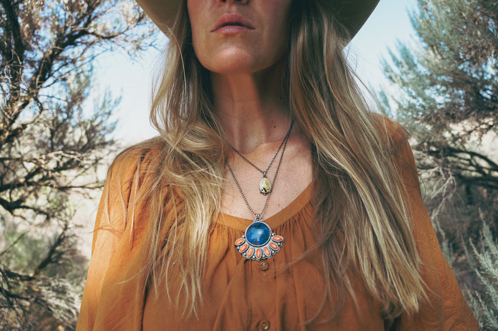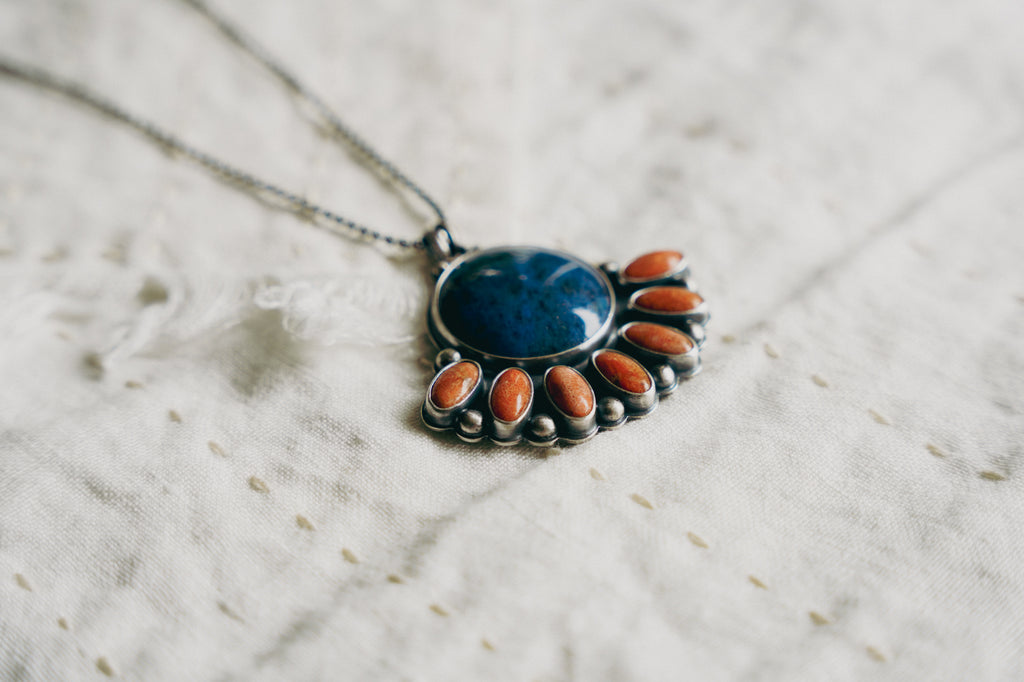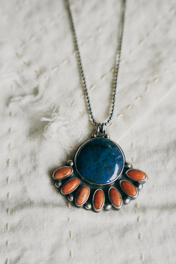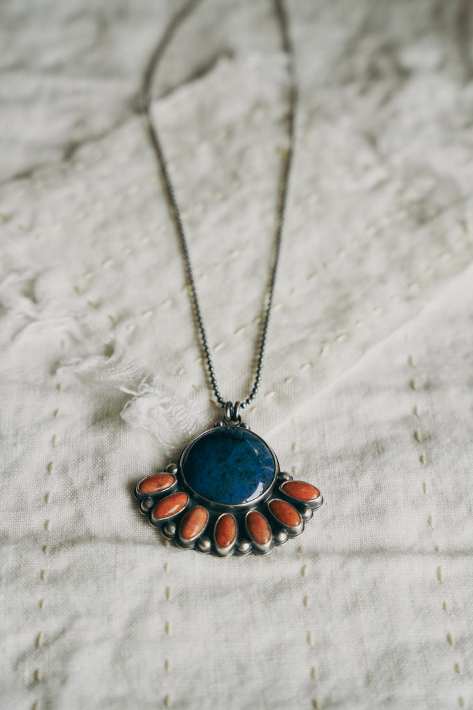 This is such a beautiful cluster style necklace featuring a big cut of dumortierite and a fan of oval corals. When I find dumortierite in a nice cut I snap it up, I've always liked the washed blues that can be found in this stone, like well worn 100% cotton denim. These washy denim blues pair beautifully with this oranged-coral. If you're a fan of COLOR, this one is for you, Amiga!