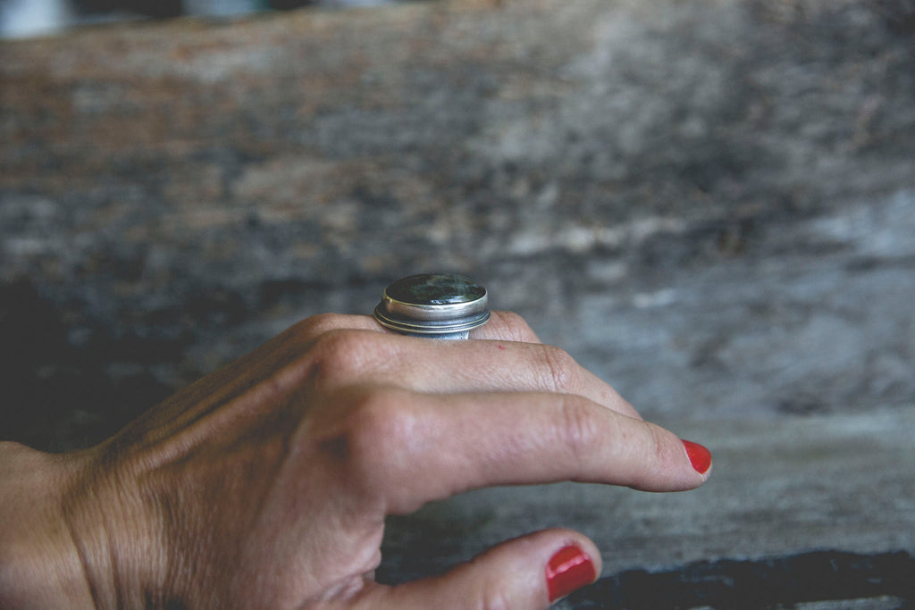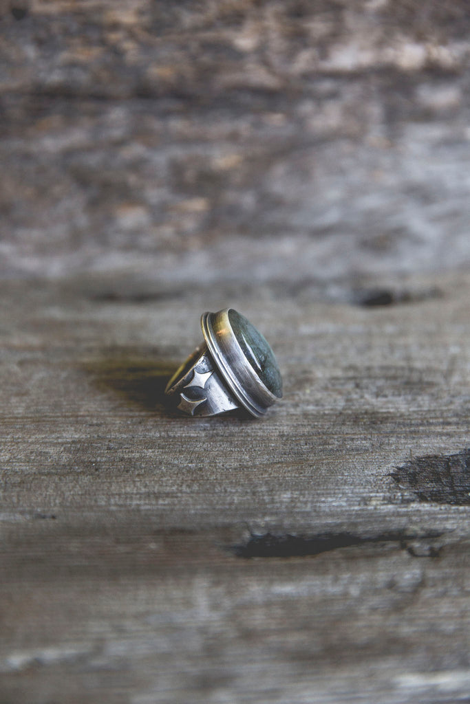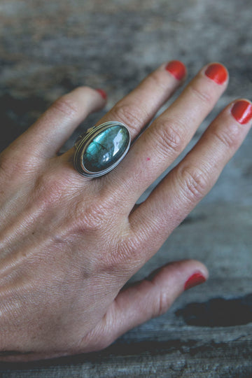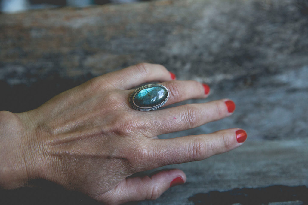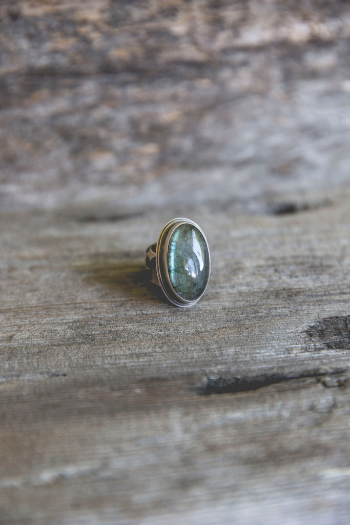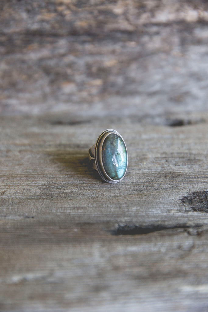 The Ancient Light Ring is built of heavy layers of sterling silver and a lovely cut of labradorite that flashes with blue fire.