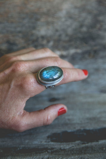 The Ancient Light Ring is built of heavy layers of sterling silver and a lovely cut of labradorite that flashes with blue fire.