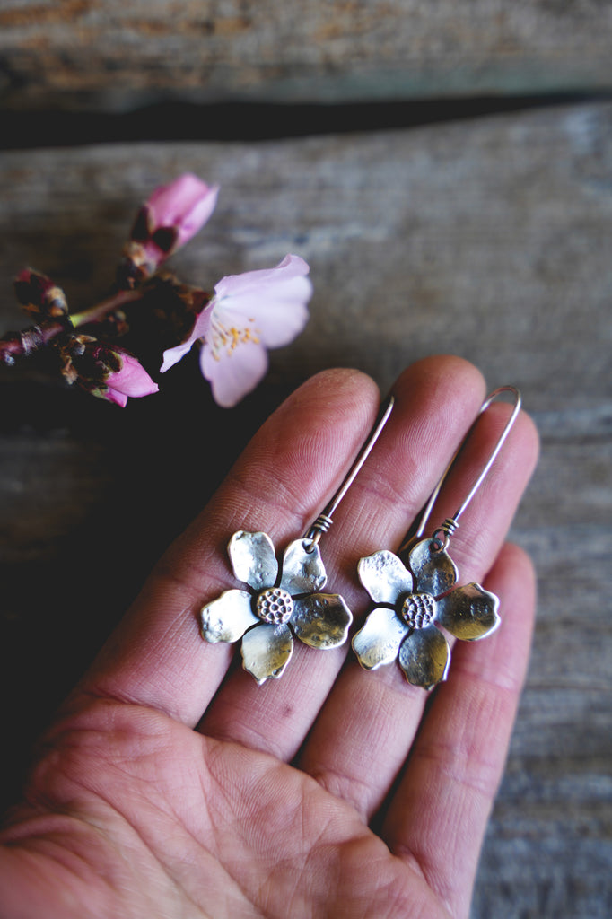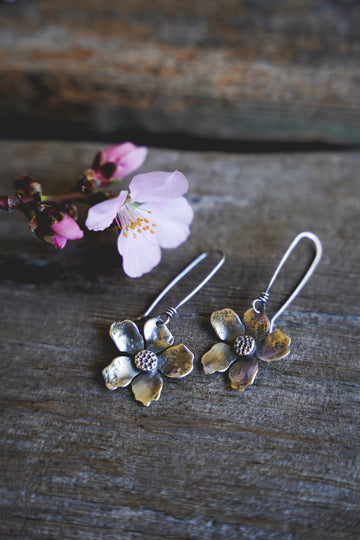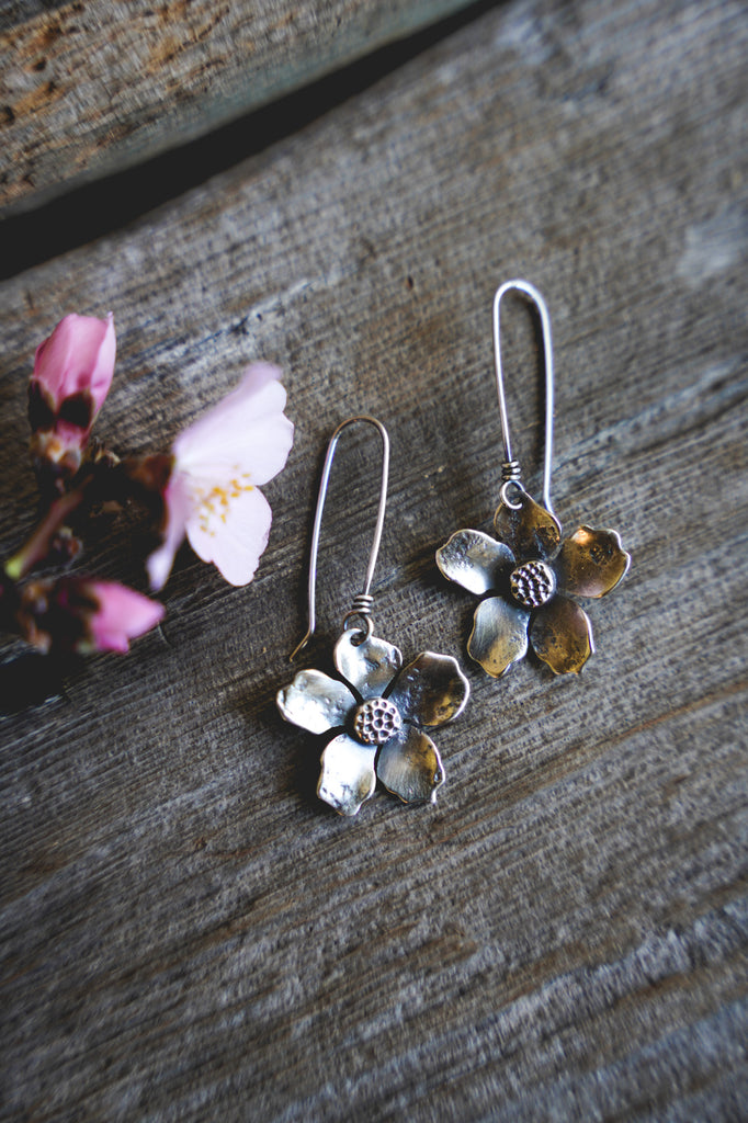 Simple, textural, hammer formed sterling silver apple blossoms on long French ear wires.