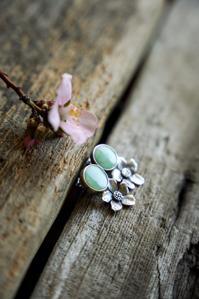 Simple, textural, hammer formed sterling silver apple blossoms fixed to mint green cuts of American turquoise.