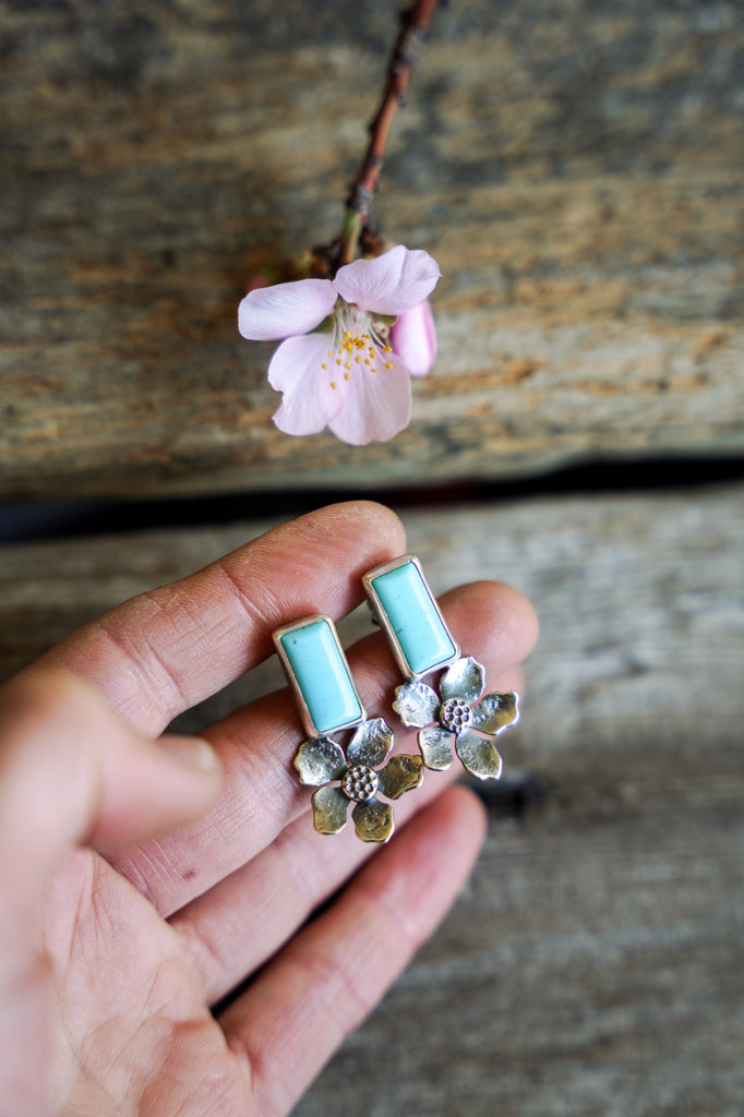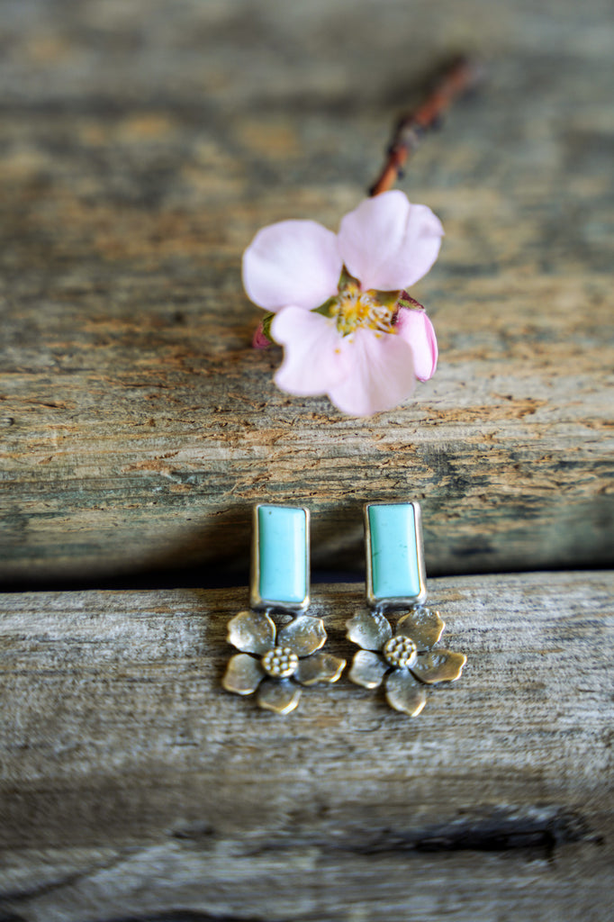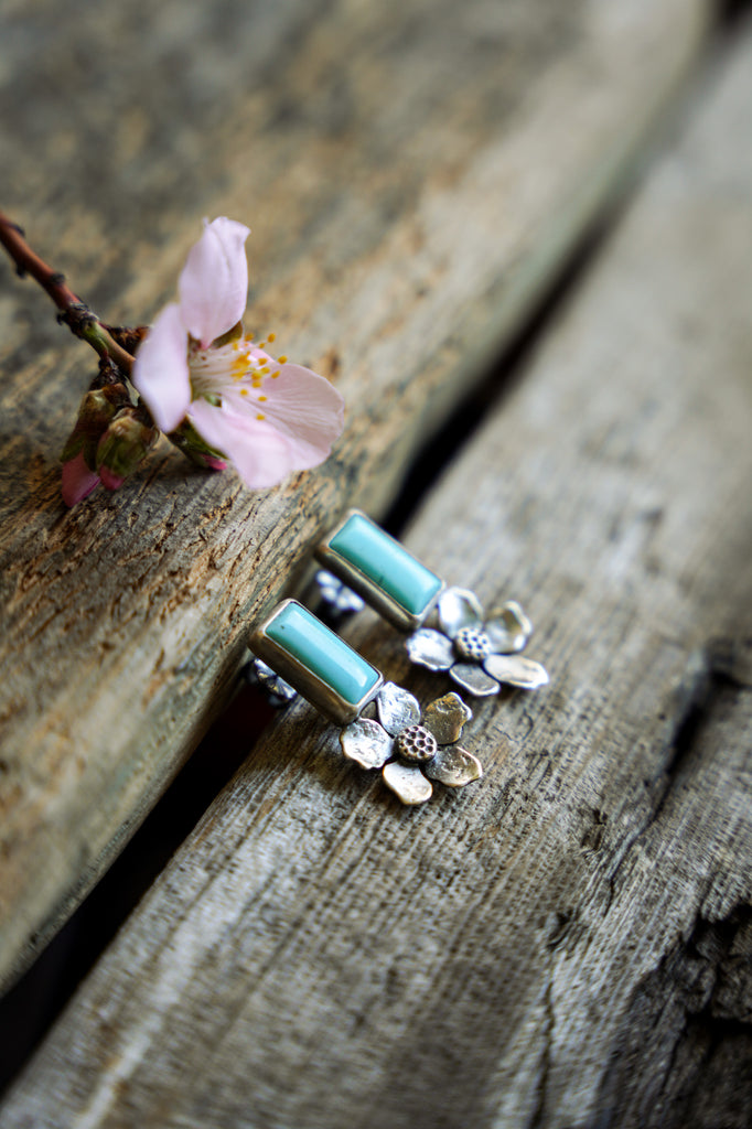 Simple, textural, hammer formed sterling silver apple blossoms fixed to clear blue cuts of Kingman turquoise.