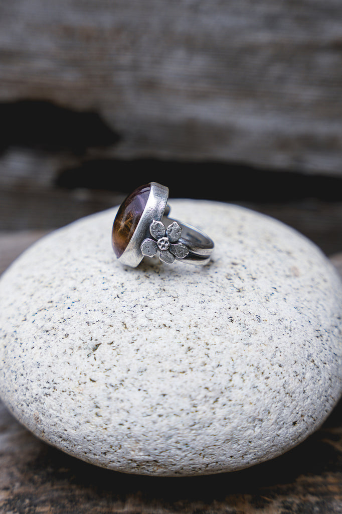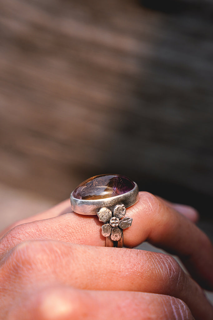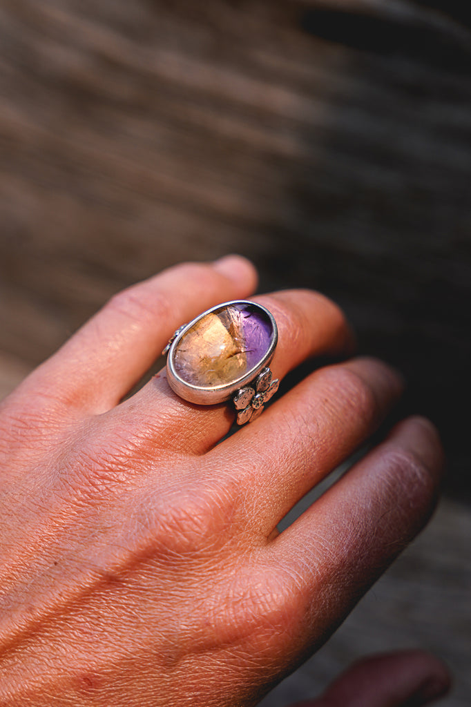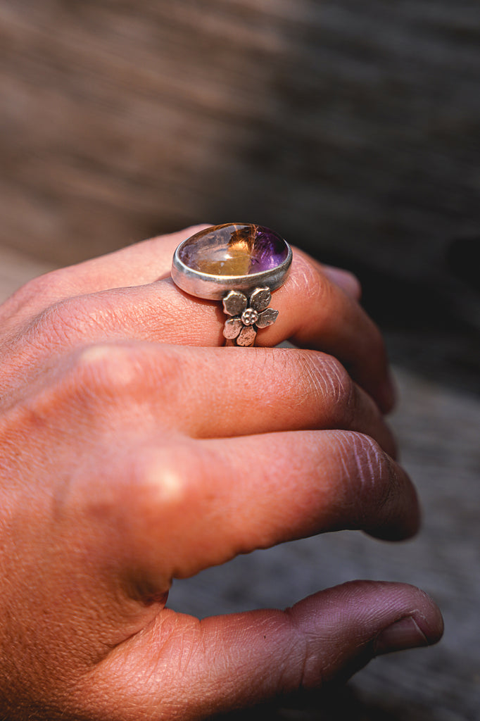 Simple, textural, hammer formed sterling silver apple blossoms paired with luminous ametrine -- heavily built but still delicate. This is a great everyday ring.
