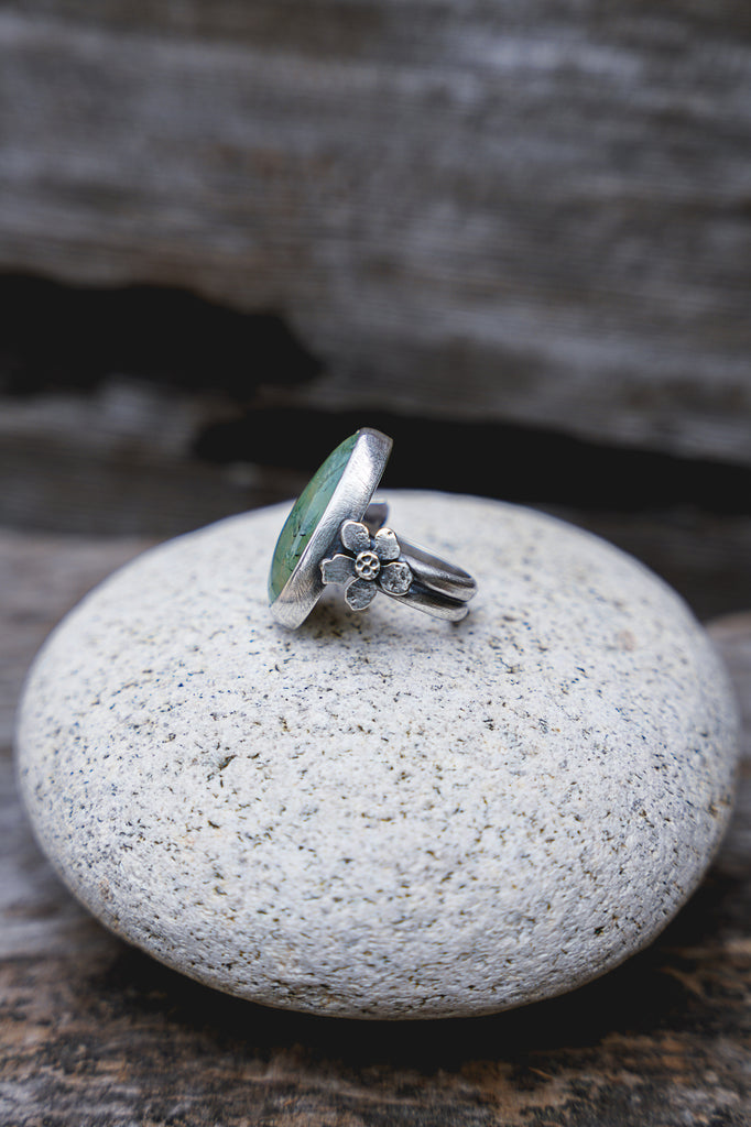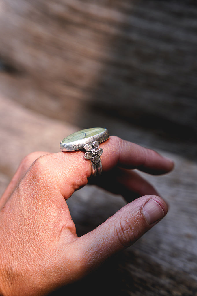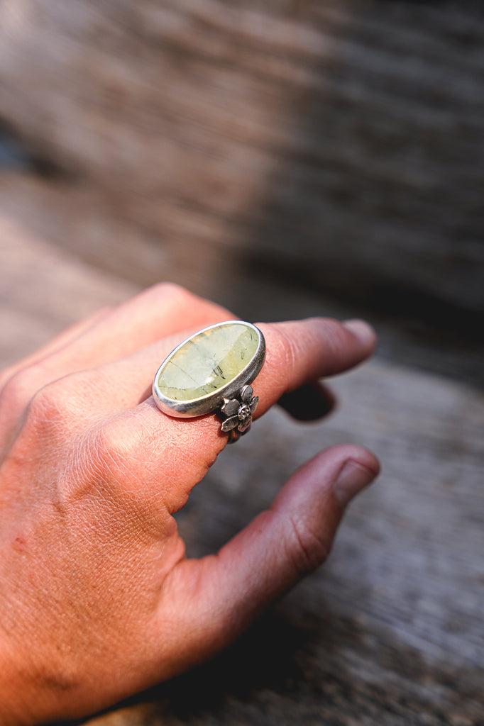 Simple, textural, hammer formed sterling silver apple blossoms paired with prehnite -- heavily built but still delicate. This is a great everyday ring.