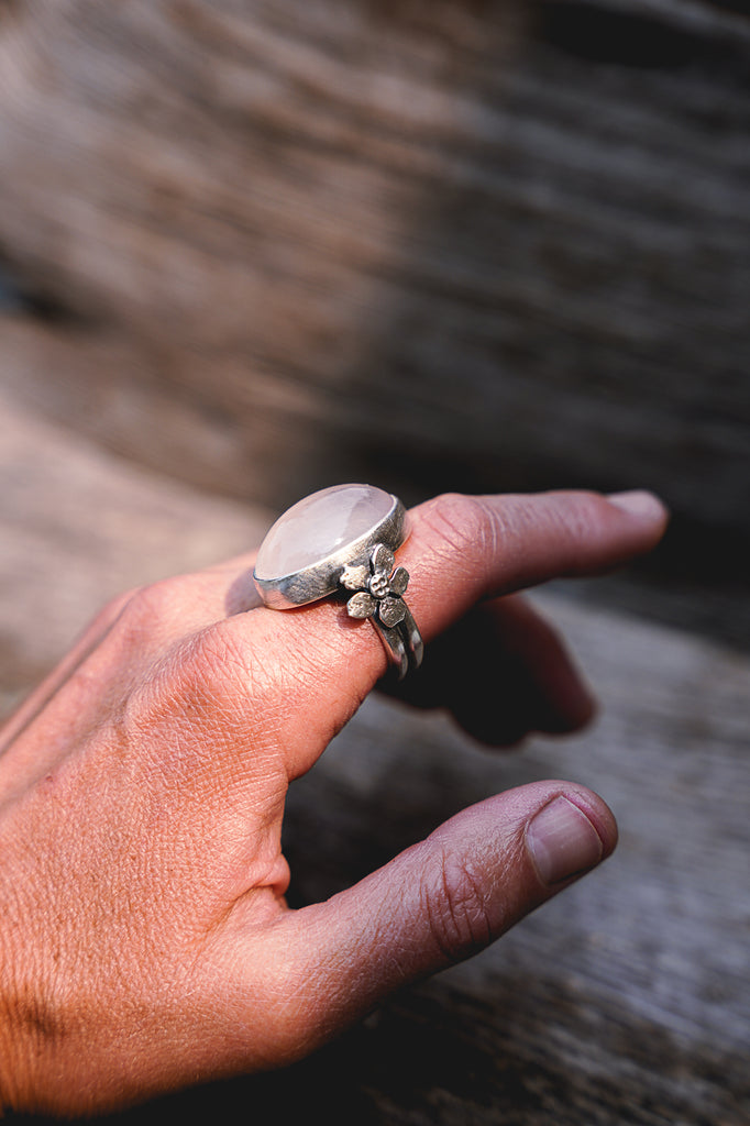 Simple, textural, hammer formed sterling silver apple blossoms paired with luminous rose quartz -- heavily built but still delicate. This is a great everyday ring.