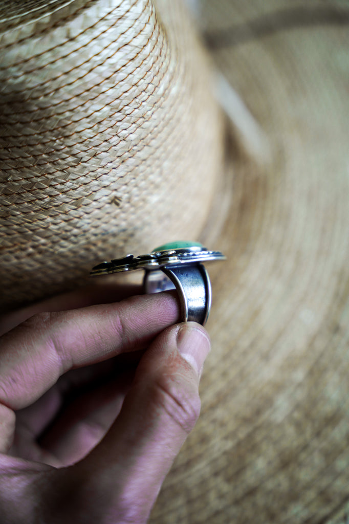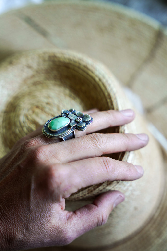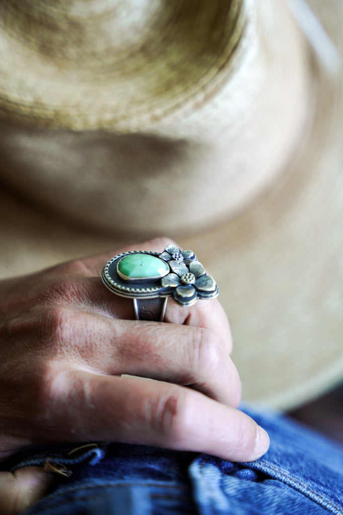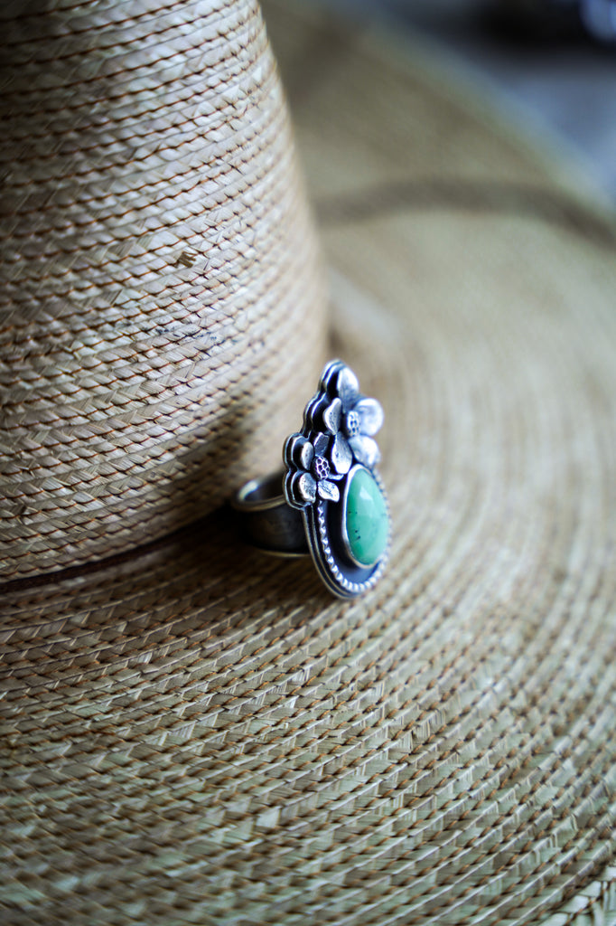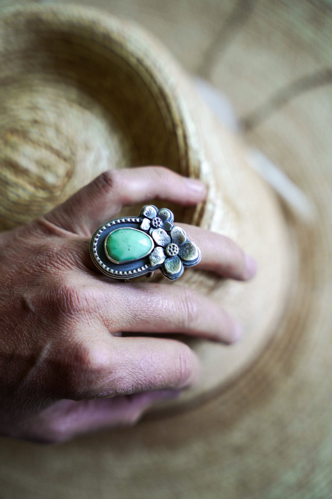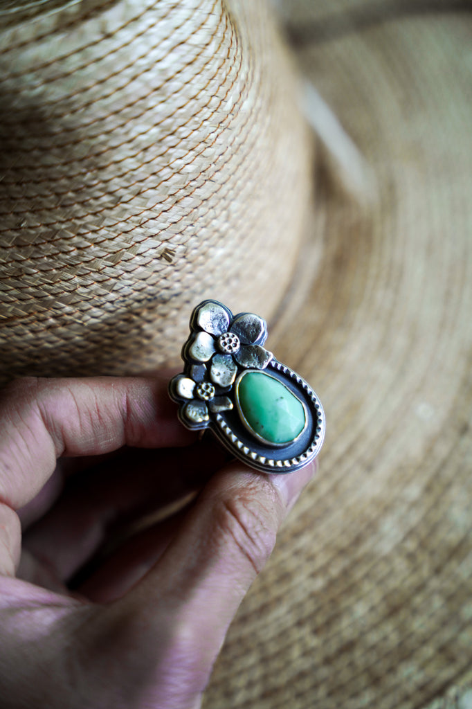 Simple, textural, hammer formed sterling silver apple blossoms paired with faceted chrysoprase. This ring is QUEENLY. Strong and feminine.