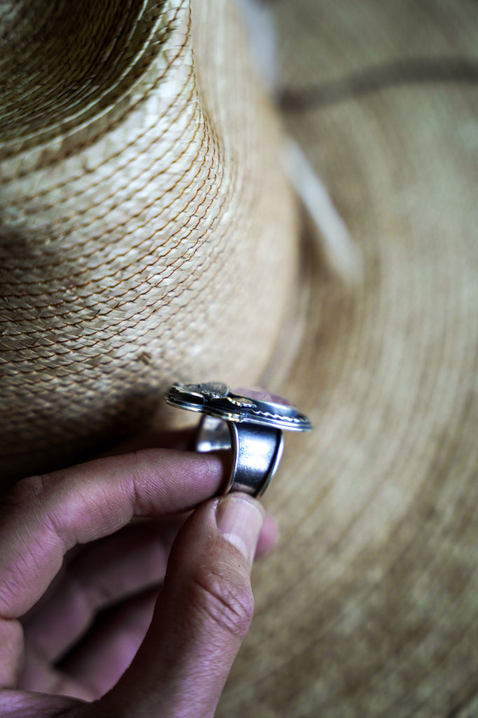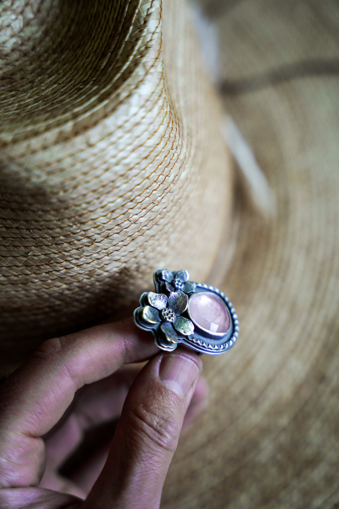 Simple, textural, hammer formed sterling silver apple blossoms paired with faceted rose quartz. This ring is QUEENLY. Strong and feminine.