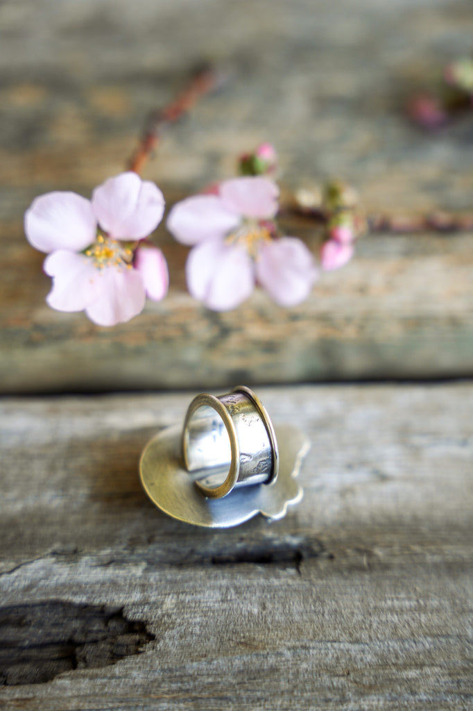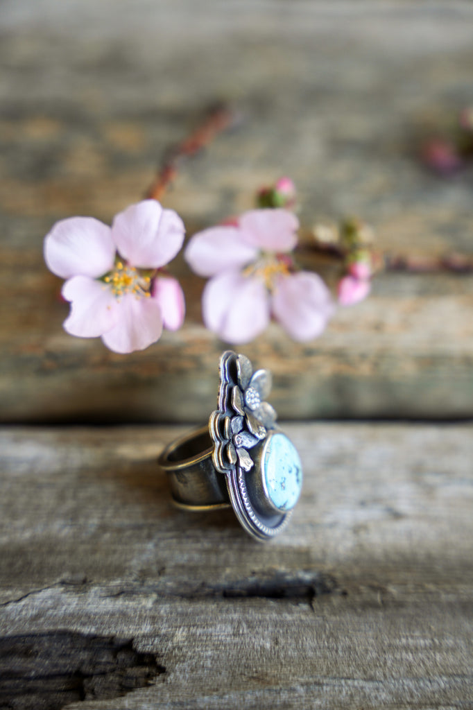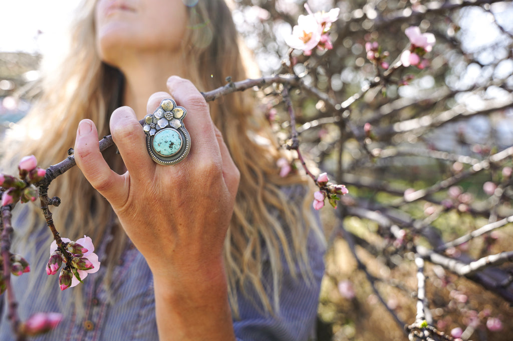 Simple, textural, hammer formed sterling silver apple blossoms paired with a lovely cut of Kingman turquoise that resembles a songbird egg. This piece is QUEENLY. One of my favorite ring designs to date. Just a fantastic build -- so strong and feminine.
