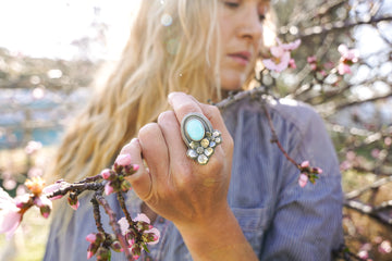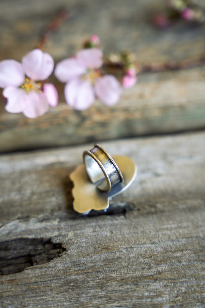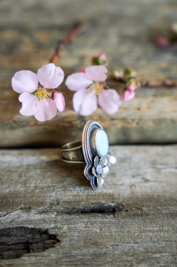 Simple, textural, hammer formed sterling silver apple blossoms paired with a gorgeous cut of clear blue Kingman turquoise. This piece is QUEENLY. One of my favorite ring designs to date. Just a fantastic build -- so strong and feminine.