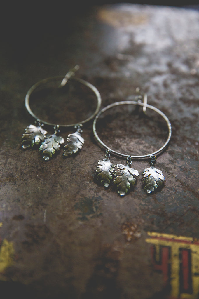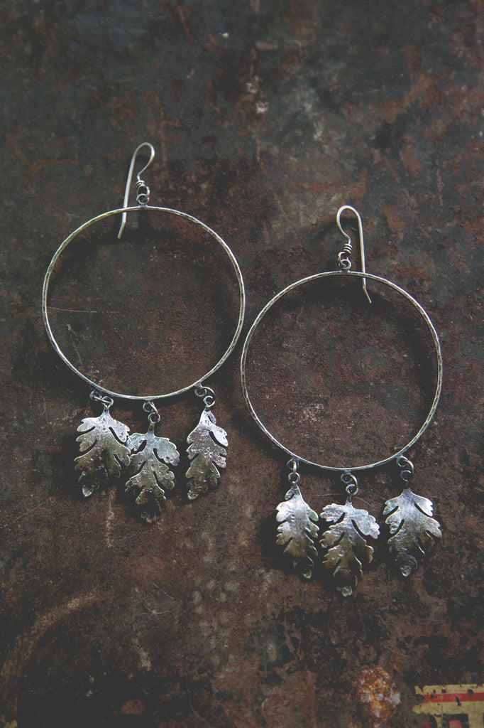 I’m still on a leaf kick over here — there’s an ocean of visual information in my gardens at the moment and I’m doing my best to draw on it! These hoops are big and bold but I kept them as light as possible and glory, how they move. Each leaf was hand sawed, textured, filed, and hammer formed. The hoops themselves were textured and work hardened by hammer so these breezy things have structure you can put some faith in. Love ’em.