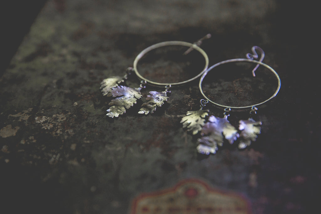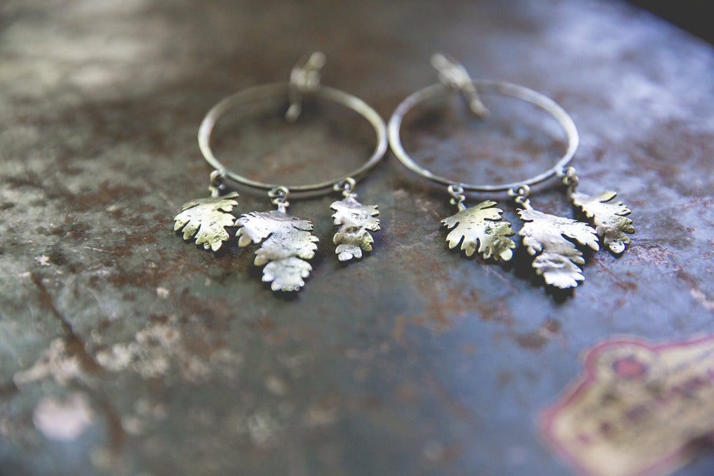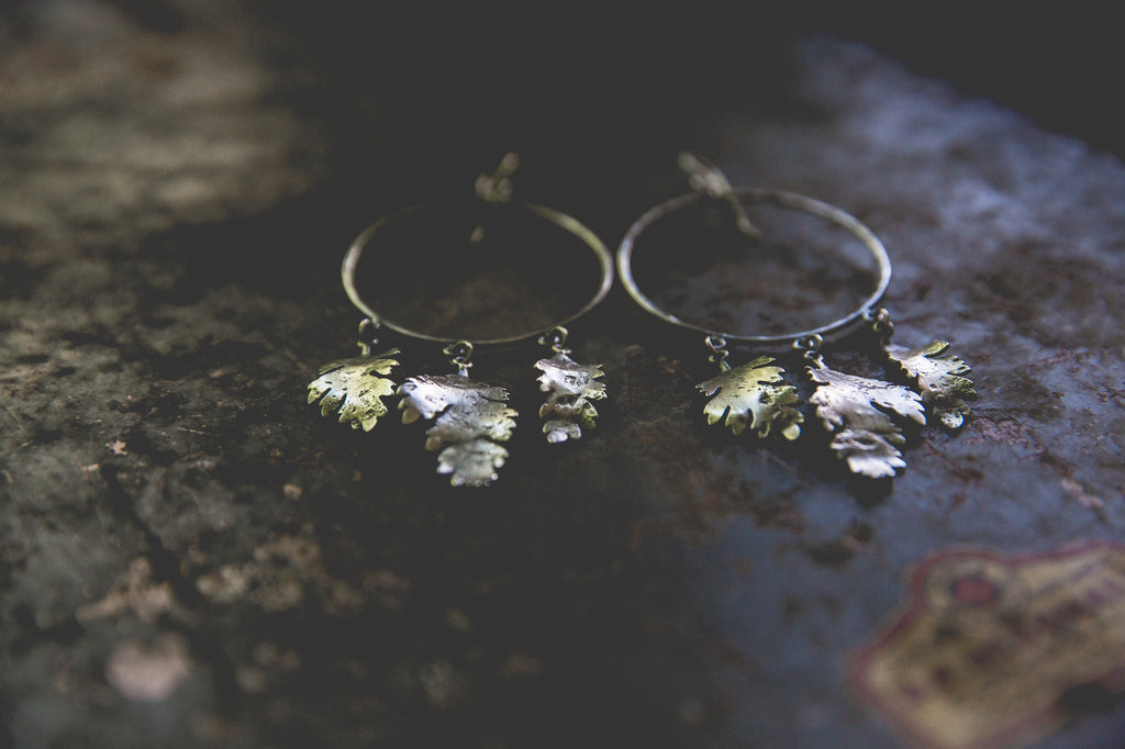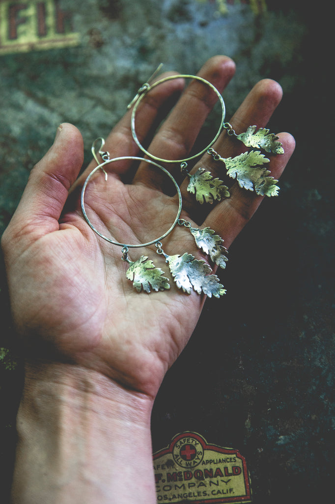 I’m still on a leaf kick over here — there’s an ocean of visual information in my gardens at the moment and I’m doing my best to draw on it! These hoops are big and bold but I kept them as light as possible and glory, how they move. Each leaf was hand sawed, textured, filed, and hammer formed. The hoops themselves were textured and work hardened by hammer so these breezy things have structure you can put some faith in. Love ’em.