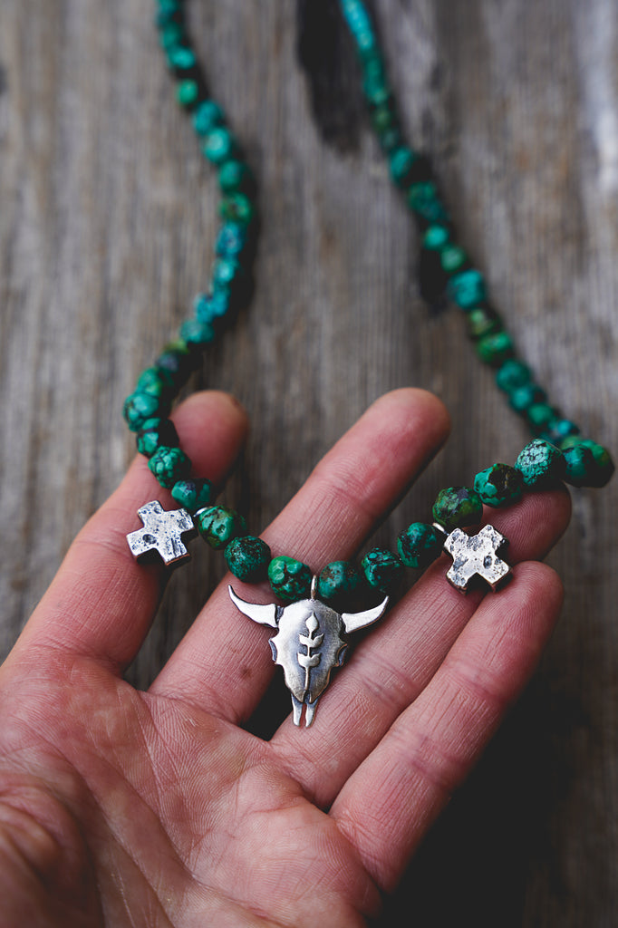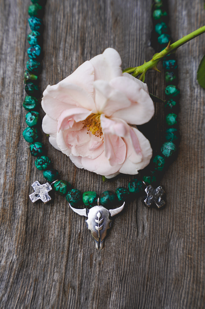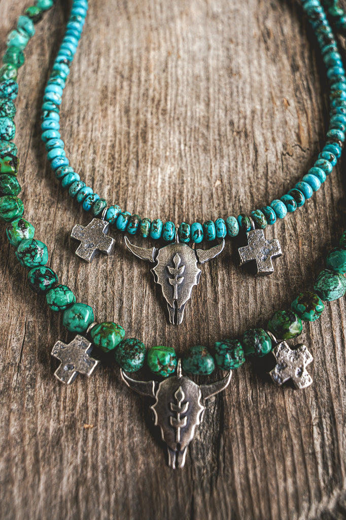 This necklace design features a bison skull motif that has been part of my work for years and years though this is a new, dimensional iteration. I've paired it with my chunky square crosses on a length of really beautiful, nuggety turquoise beads. These rugged textures and symbols create a piece that is a perfect blend of dusty and rusty and trusty. Deliciously western.