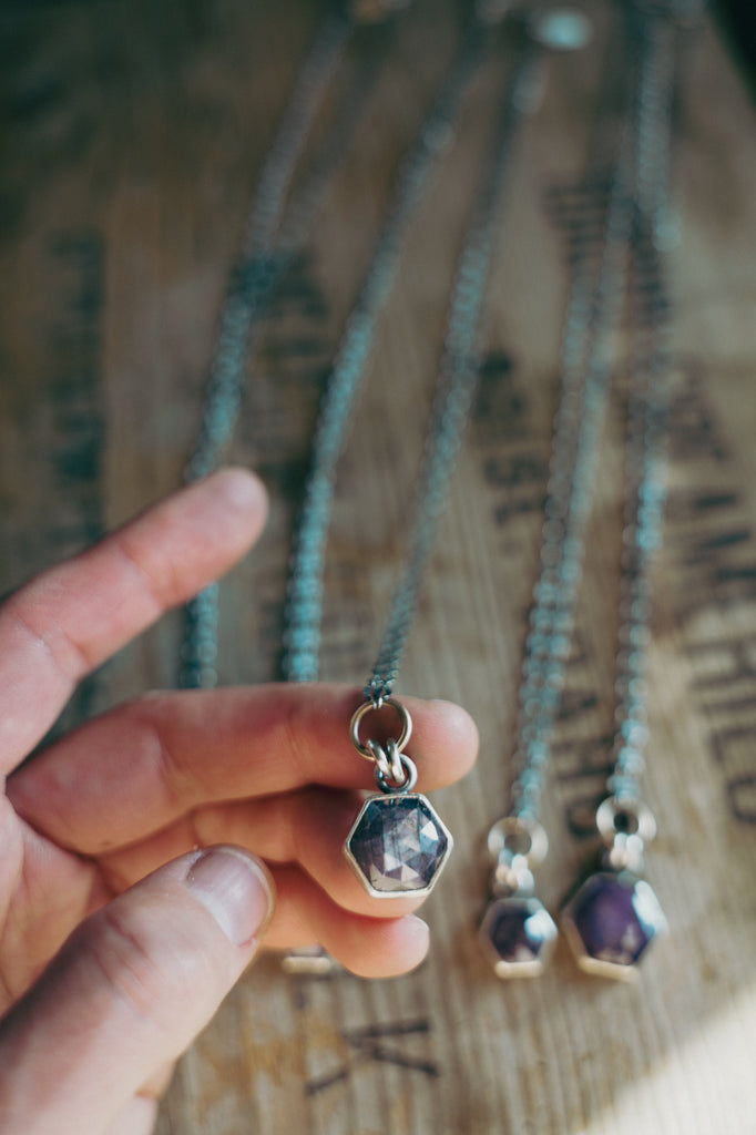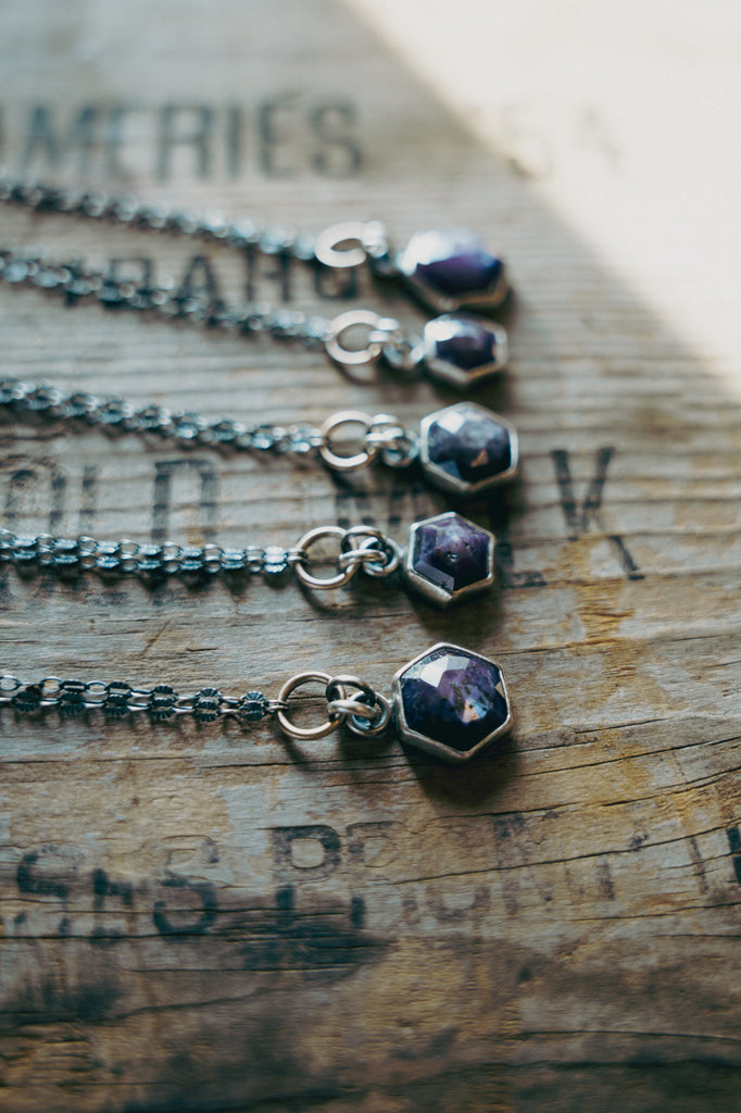 Here are some flashy little slips of sapphire set simply in sterling silver with bronze accents at the bail and clasp. These stones speak quietly of mystery and beauty and the cosmos...they remind me of the Northern Lights and all the years of my life I spent living beneath an electric sky at home in Saskatchewan.